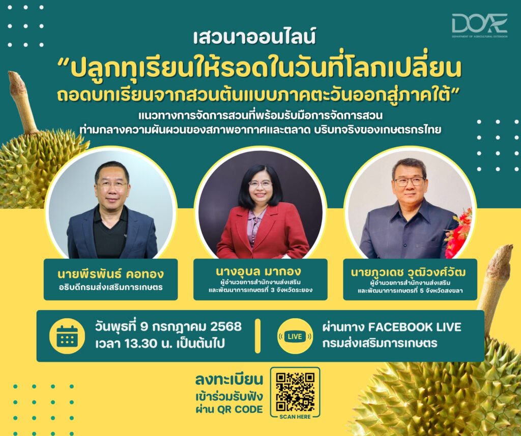ข่าวประชาสัมพันธ์🔴ขอเชิญรับชม เสวนาออนไลน์ 📢ประเด็น “ปลูกทุเรียนให้รอดในวันที่โลกเปลี่ยน : ถอดบทเรียนจากสวนต้นแบบภาคตะวันออกสู่ภาคใต้” admin / 4 กันยายน 2025 แนวทางการจัดการสวนที